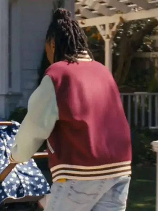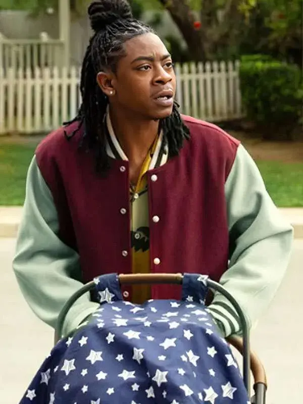 Worn by RJ Cyler in The Burbs series, this maroon and light blue varsity jacket features wool fabric, soft viscose lining, full length sleeves, ribbed cuffs, rib knit collar, and button closure, including two outside pockets and two inside pockets. It enhances youthful street style.