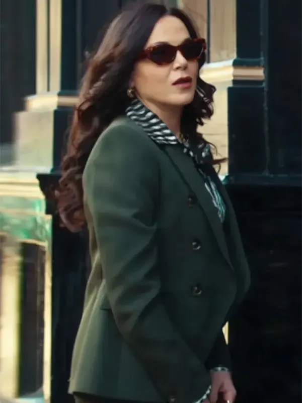 Worn by Jocelyn Stone in The Rainmaker series, this blazer is built using suiting fabric, soft viscose lining, full length sleeves, buttoned cuffs, lapel collar, button closure, two outside pockets and one inside pocket in dark green. It offers elegance and authority for professional environments.