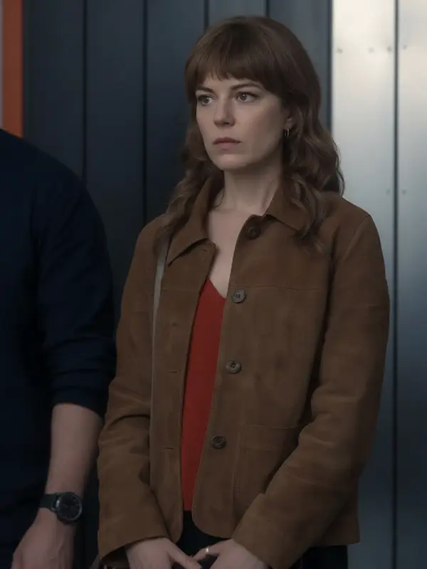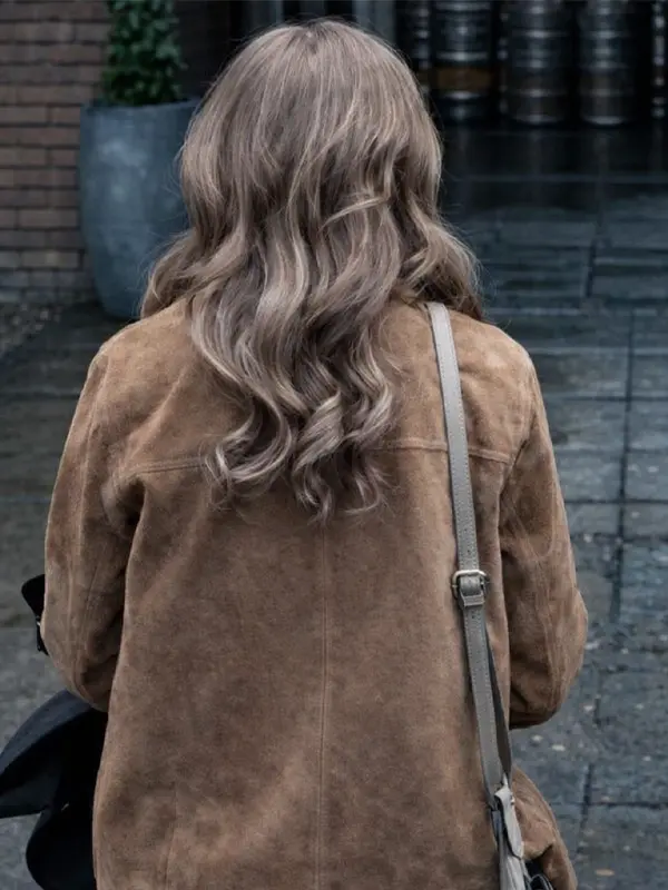 This Emily Hunter Jacket from The Revenge Club series is made using suede leather material, soft viscose lining, full length sleeves, button closure, open hem cuffs, a shirt style collar, two outside pockets, one inside pocket, and brown color. It is ideal for smart casual looks, daytime events, and character inspired fashion from the series wardrobe.