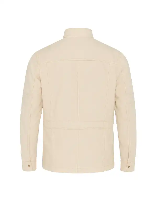 This jacket is worn by Ben Richards from The Running Man. This off-white cotton jacket features soft viscose lining, full sleeves, zipper closure, buttoned cuffs, an erect collar, and multiple pockets. It is perfect for casual outings, themed events, fan gatherings, and anyone wanting screen-accurate style for ultimate authenticity.