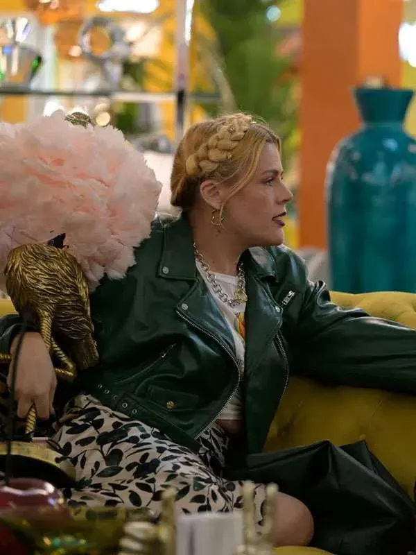 Worn by Darby in The Young and the Restless series, this green jacket features genuine leather, soft viscose lining, full length sleeves, zipper cuff, lapel style collar, and zipper closure, including two outside pockets and one inside pocket. It is ideal for casual evenings and modern looks.