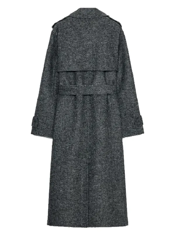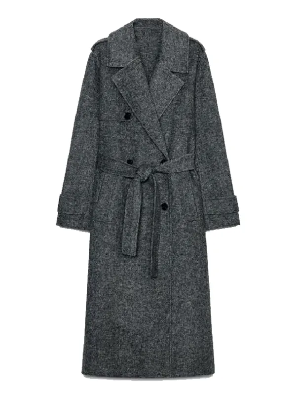 Step out in sophisticated style with this charcoal gray wool coat, inspired by Hayley Erin’s look in The Young and the Restless Season 53. This longline trench coat is crafted from a high-quality wool blend, featuring a double-breasted button front and a matching waist belt. It’s the perfect choice for professional elegance and essential winter warmth.