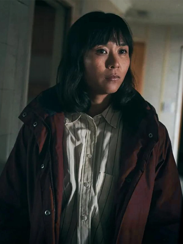 Face the elements in style with this maroon puffer jacket, inspired by Jess Deng in Under Salt Marsh. It features a high-stand collar, full-length sleeves with elastic cuffs, and a secure snap-button front. This functional outerwear offers exceptional warmth and a sleek silhouette, making it an essential choice for any chilly adventure.