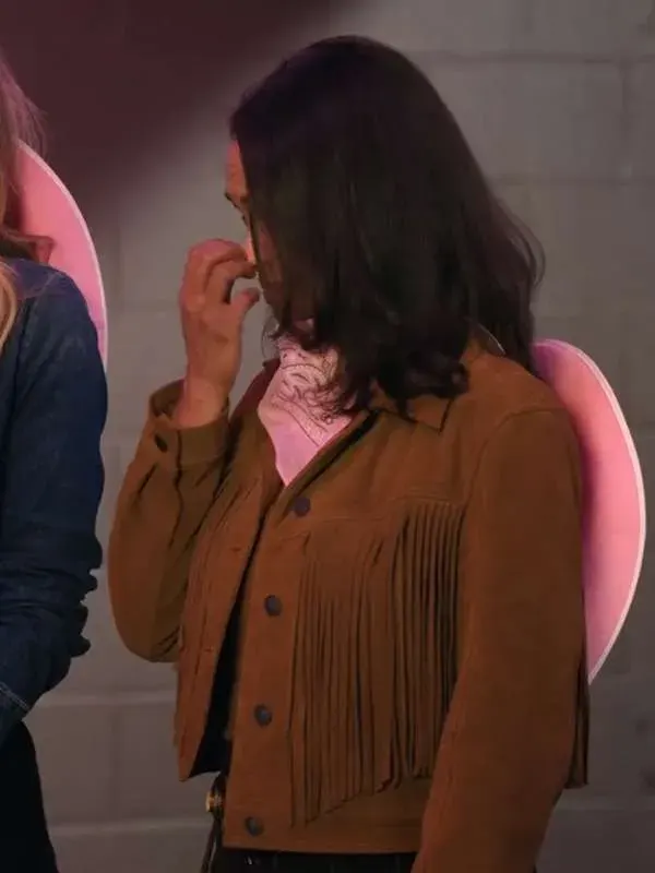 Styled by Kaia Bryant in the Virgin River series, this fringe jacket is tailored using suede leather, smooth viscose lining, full length sleeves, buttoned cuff, shirt style collar, and button closure with two outside pockets and one inside pocket. It complements unique outfits and confident fashion choices.