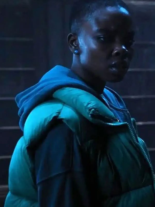 This vibrant green puffer vest, worn by Joy Sunday on Wednesday, offers both style and comfort. Constructed from durable Parachute Fabric with a soft Viscose lining, it includes a secure Zipper Closure and a warm Stand-Up Collar. Its bright color makes it a perfect piece for an eye-catching, casual look.