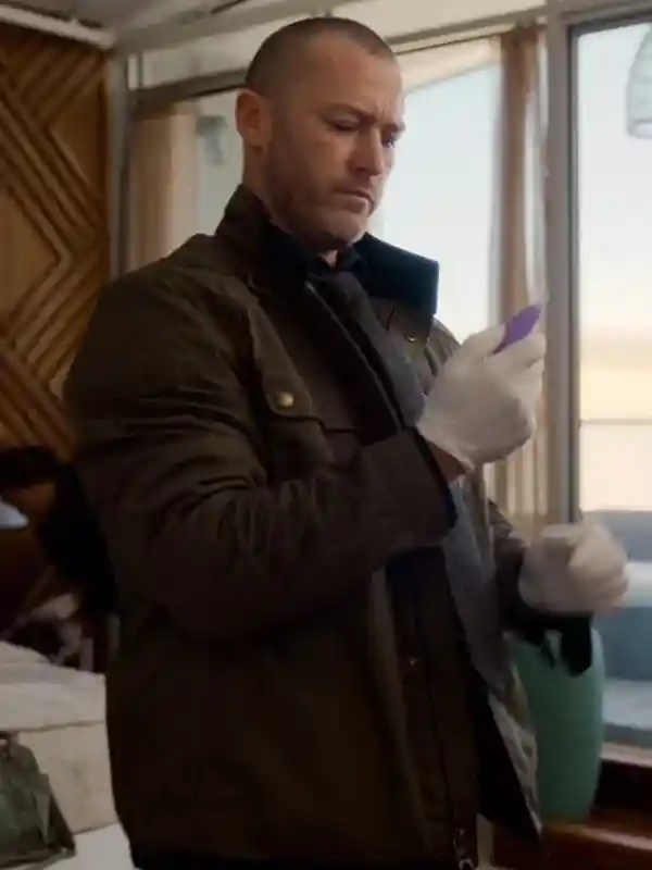 The Michael Ormewood Green Jacket from the Will Trent series is tailored using cotton fabric, smooth viscose lining, full length sleeves, buttoned cuff, shirt style collar, and zipper closure with four outside pockets and two inside pockets. It complements everyday outfits and comfortable fashion choices.