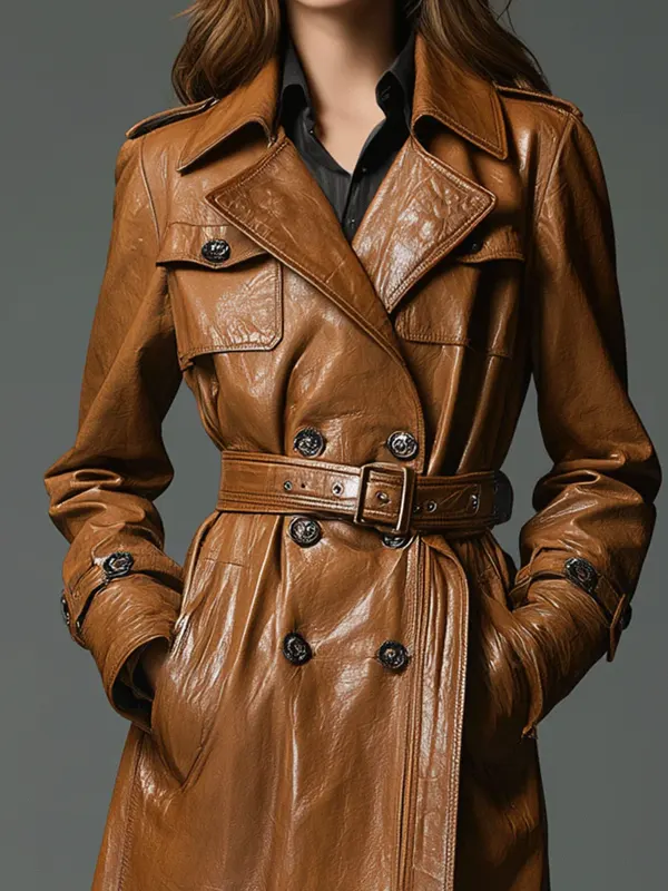 This brown faux leather trench coat offers timeless elegance with a sleek leather-style finish and soft lining for comfort. Its long cut drapes gracefully and enhances outfits with understated sophistication. Perfect for cool evenings, autumn walks, or smart-casual evenings out a refined coat that pairs beautifully with boots or dresses.