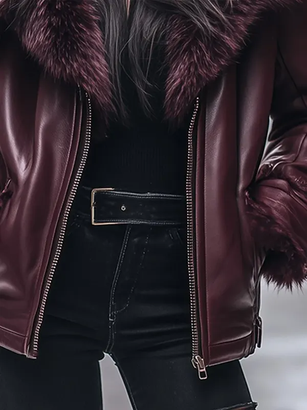 This rich burgundy leather jacket with plush faux-fur trim offers cozy warmth and luxe texture. Soft faux fur collar and cuffs add extra comfort while smooth leather-style exterior stays sleek and stylish. Whether heading out for a casual dinner or a winter stroll this piece elevates outfits with comfort, warmth, and timeless charm.