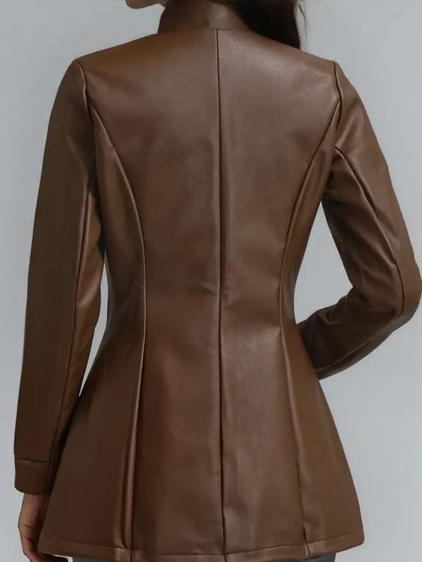 Crafted from rich chocolate-toned leather-style material and lined for comfort, this jacket brings classic sophistication to casual outfits. Its versatile brown hue pairs easily with jeans, dresses, or skirts. A practical yet stylish choice for everyday wear, transitional seasons, or relaxed evenings out.