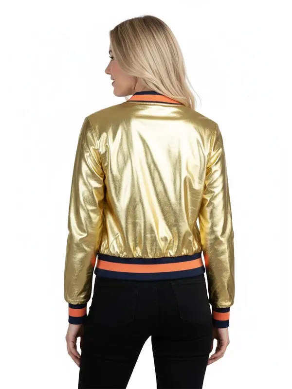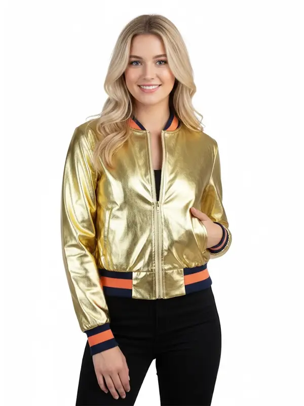 Womens Golden Bomber Cropped Jacket is built using metallic PU leather, soft viscose lining, full length sleeves, ribbed cuffs, rib knit collar, zipper closure, two outside pockets, one inside pocket, and golden color. It suits evening plans, meetups, shopping trips, and casual wear when you want eye catching fashion.