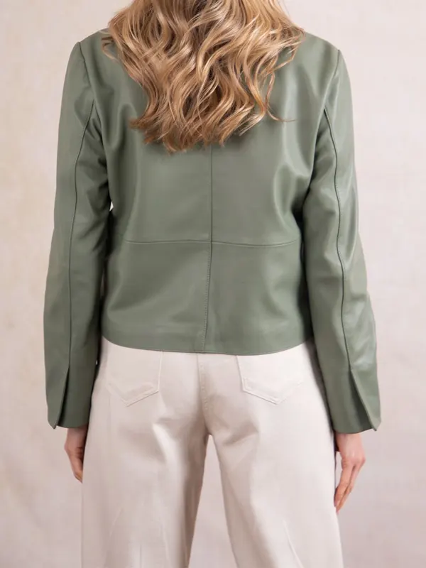 This Women’s Kendal Collared Leather Jacket reflects a refined character concept, built with genuine leather, viscose lining, full sleeves, button closure, buttoned cuffs, a shirt collar, and four pockets. Its sage-green tone adds calm sophistication, making it perfect for brunches, creative workplaces, and relaxed social gatherings where polished styling and subtle color matter most.