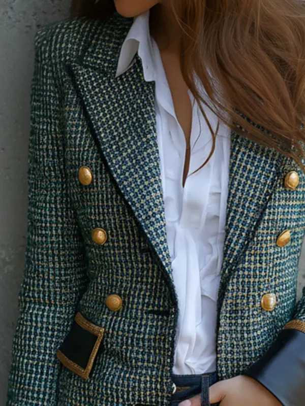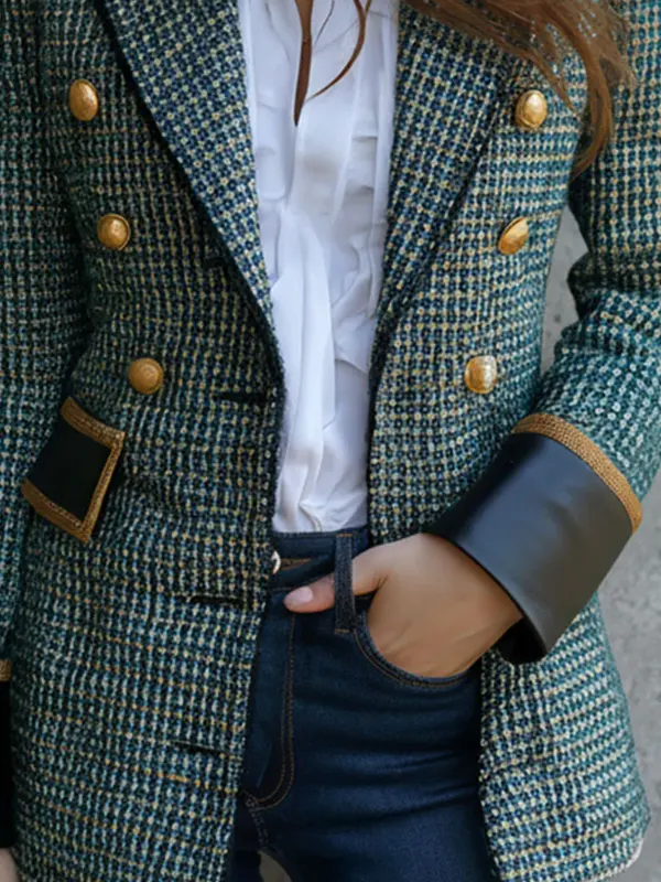 This blazer blends classic tweed charm with leather-trim detailing for a sophisticated touch. The structured design and leather accents create a refined yet modern look. Great for smart-casual occasions, office wear or brunch meets ideal when you want to combine polished tailoring with subtle fashion edge.