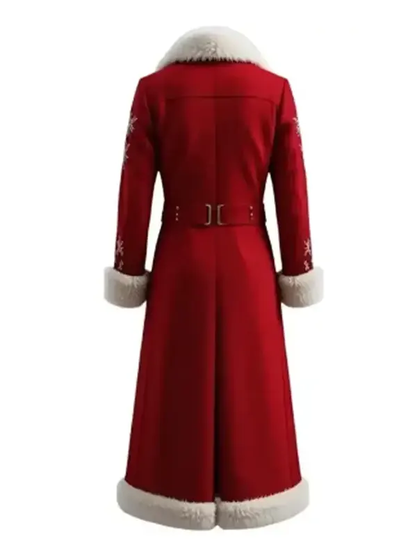 This red trench coat with faux-fur accents and snowflake-inspired flair gives a warm, festive feel with a polished silhouette and soft lining. Its longer length adds elegance while keeping you cozy during winter evenings or holiday strolls. Perfect for Christmas events, winter dinners, or seasonal outings where you want subtle festive charm.
