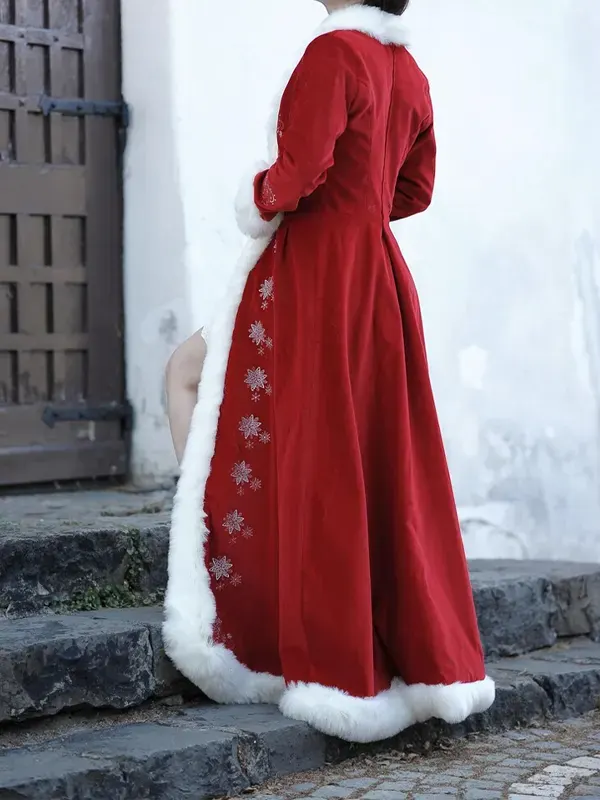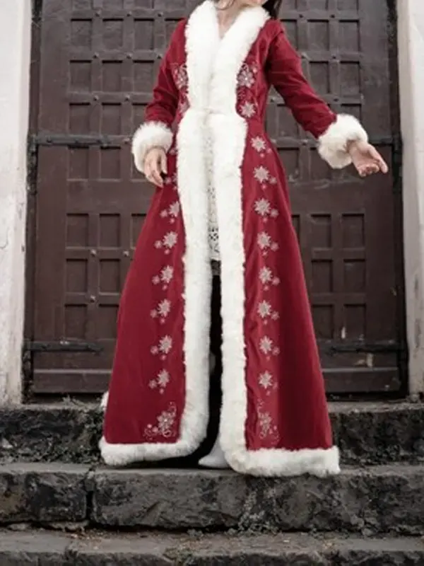 Women’s Red Christmas Long Velvet Coat With Snowflake Embroidery