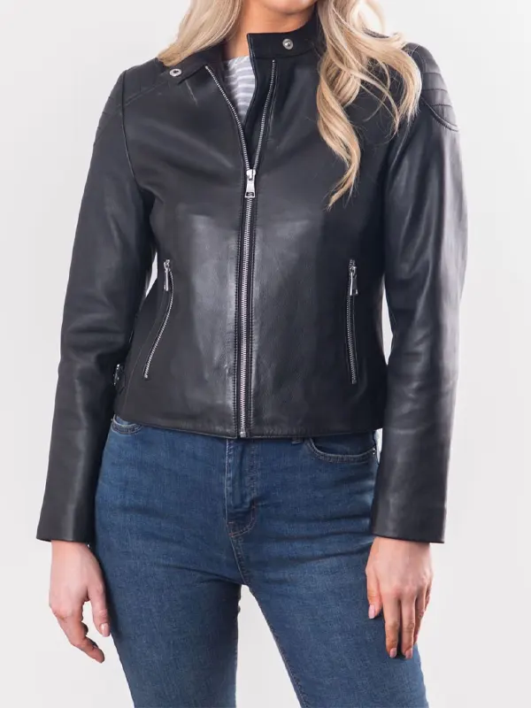The Women’s Tebay Black Leather Jacket is ideal for enhancing a sleek everyday look through its genuine leather build and smooth viscose comfort. Full sleeves, a zipper front, open cuffs, a snap collar, and multiple pockets provide practical style suited for city walks, meetups, informal dinners, and effortless day to night transitions.