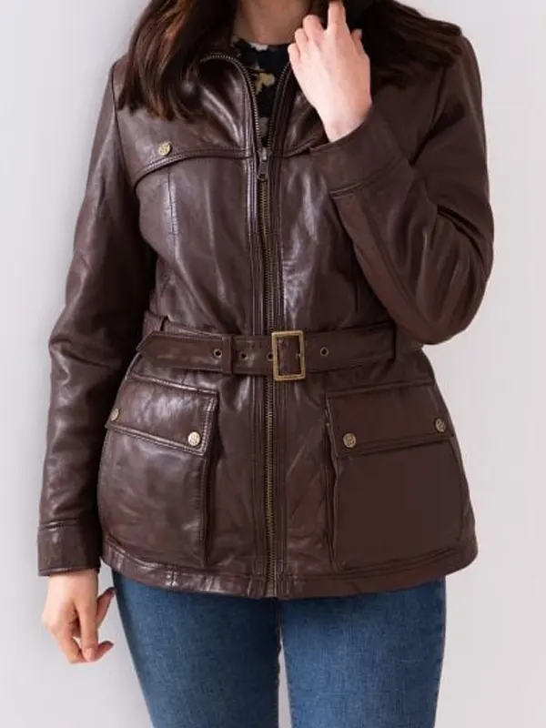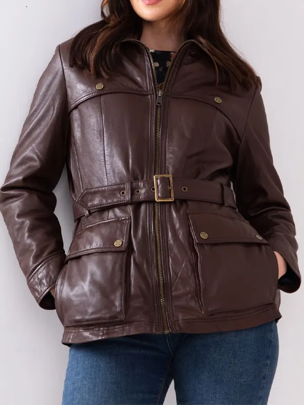 This Women’s Temple Brown Belted Leather Coat draws from a graceful character design, crafted from genuine leather with viscose lining, full sleeves, a belted zipper closure, open-hem cuffs, a shirt collar, and four pockets. Its rich brown finish makes it perfect for autumn outings, elegant dinners, and refined gatherings where warmth, structure, and classic styling shine together.