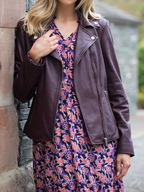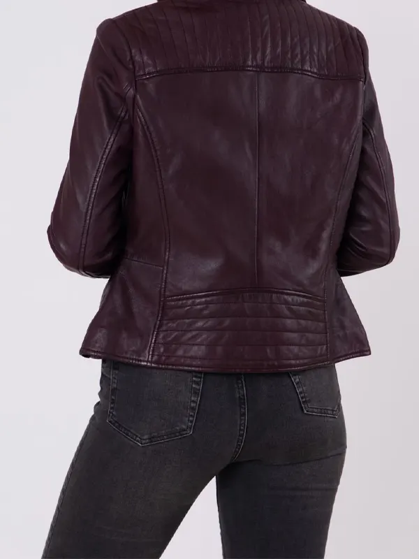 The Thirlmere Biker Leather Jacket is crafted using genuine leather, supported by a soft viscose lining, and designed with full sleeves, a smooth zipper front, open hem cuffs, a defined lapel collar, and practical pockets. Its bold berry tone suits evening outings, city plans, and confident everyday styling for you.