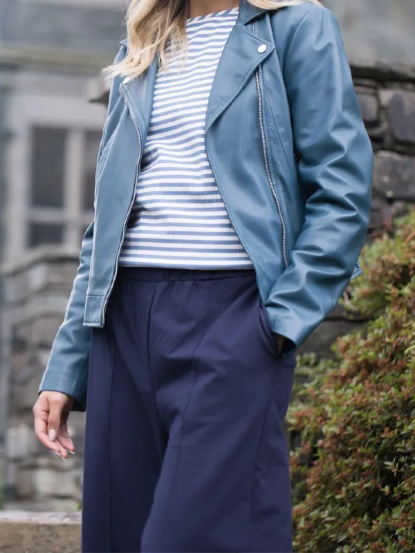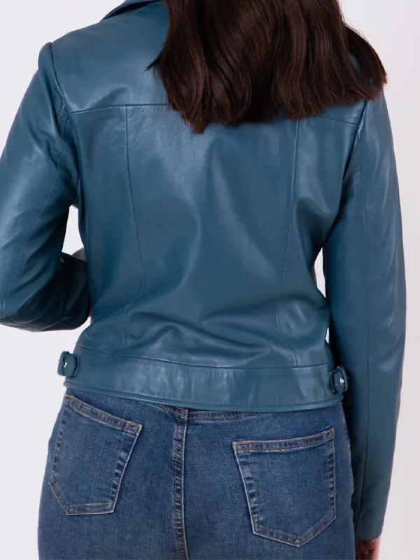 The Womens Thornhill Blue Leather Biker Jacket is made of real leather with a bright finishing. The jacket features a zipper closure, lapel collar and a streamlined shape which is ideal for making a bold statement. The jacket is also comfortable due to its viscose lining and has practical pockets, thus, it can be your perfect urban outings as well as elevated everyday ensemble.