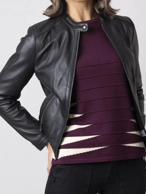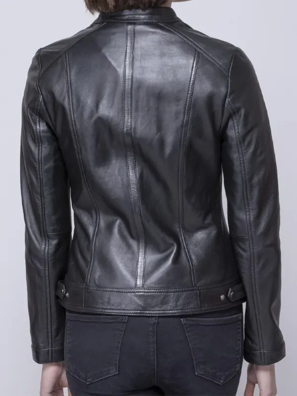 This Women’s Thorpe Black Leather Jacket carries a streamlined modern tone, built with genuine leather, viscose lining, full sleeves, zipper closure, open hem cuffs, a snap collar, and three pockets. Its deep black style makes it perfect for casual dinners, everyday errands, and relaxed streetwear sessions where versatility, comfort, and classic minimal elegance are essential.