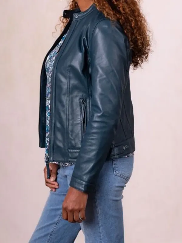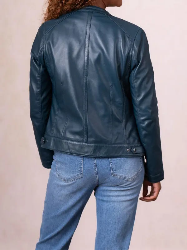 The Threlkeld Blue Leather Jacket is crafted using genuine leather, paired with a gentle viscose lining, and styled with full sleeves, a clean zipper front, open hem cuffs, a neat snap tab collar, and handy pockets. Its calm blue color suits relaxed gatherings, city walks, and polished everyday wear with ease.